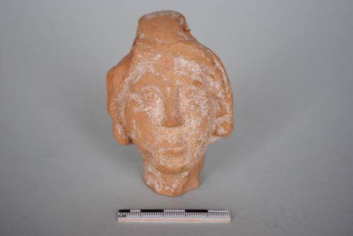 Testa femminile dal volto pieno, con lineamenti minuti resi sommariamente. Capelli spartiti sulla fronte in due bande ondulate, con una ciocca rialzata alla sommità del capo. Terracotta rossastra.
