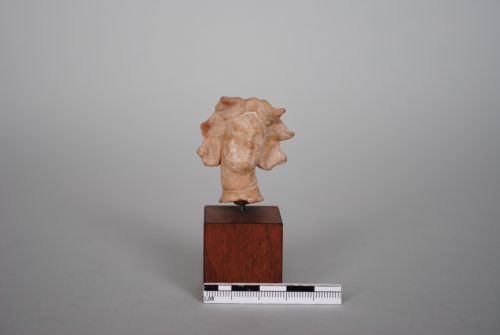 Testa di "tanagrina" leggermente inclinata verso destra. Volto delicato e paffuto. Capelli suddivisi in bande. Sulla testa corona lanceolata. Terracotta nocciola chiaro