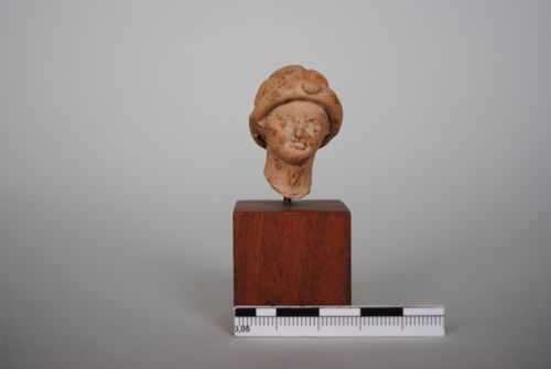 Testa di "tanagrina" leggermente inclinata. Il viso è paffuto con lineamenti aggraziati. I capelli presentano la classica acconciatura "a melone", divisi in spicchi. Sulla fronte un diadema con gemma lenticolare. Terracotta nocciola chiaro.