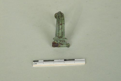 testa rettangolare ripiegata verso lesterno a formare la cerniera, dotata di perno in ferro originariamente fermato alle due estremità da pomelli semicircolari di cui solo uno si è conservato. La testa, forata alle estremità, laterali è caratterizzata dalla presenza di una doppia modanatura in rilievo nella parte orizzontale inferiore e superiore; probabilmente poteva essere decorata da occhi di dado, ma le ossidazioni superficiali non ne permettono una lettura ottimale. Larco semicircolare rilevato, ha una sezione triangolare ed è ornato, lungo l'asse mediano, da una modanatura centrale decorata da linee trasversali parallele incise tra due modanature laterali, mentre lungo i bordi è segnato da due modanature in rilievo. La staffa piena è chiusa all'apice da un bottone circolare modanato, mentre l'ardiglione ha una sezione quadrangolare irregolare.