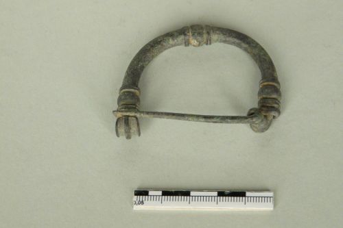 fibula a molla a tre avvolgimenti con arco semicircolare a sezione circolare che, nella parte superiore è stato inciso e lavorato in modo da formare un vago globulare tra due elementi circolari appiattiti in rilievo; in corrispondenza dell'attacco alla molla termina con un elemento circolare in rilievo seguito da un vago globulare e due circolari appiattiti, mentre in corrispondenza della staffa tricostolata con un vago globulare e uno circolare appiattito in bronzo. L'ardiglione ha una sezione circolare.