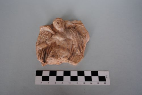 Lastra della cui decorazione rimane la parte superiore di una figura alata, nuda, con mantello che scende dalla spalla sinistra in larghe pieghe. La testa è inclinata verso destra ed è incorniciata da uno svolazzo del mantello. I capelli sono divisi in due bande ondulate sulla fronte e sono trattenuti da una tenia. Terracotta nocciola chiaro.