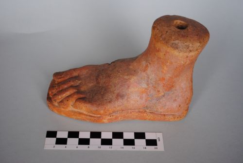 Ex voto a forma di piede umano nudo, con dita e unghie dalla resa naturalistica. Cavo.