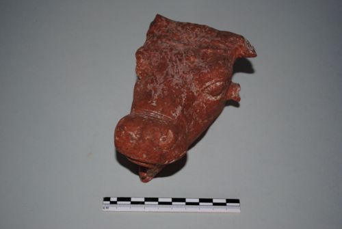 Testa di bovide con muso allungato, bocca chiusa, occhi molto sporgenti. Terracotta rossastra.