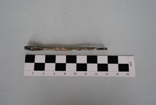 Ago da cucito pesante con stelo e cruna a sezione rettangolare. Presenza di due fori passanti circolari nella cruna.