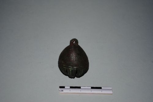Sonaglio da collare per animali a forma di palla ovoidale con piccolo anello di sospensione. La superficie è decorata a metà da due linee parallele incise. La parte inferiore è formata da otto elementi triangolari costolati, non uniti tra loro, che si riuniscono alla base. All'interno rimane la pallina.