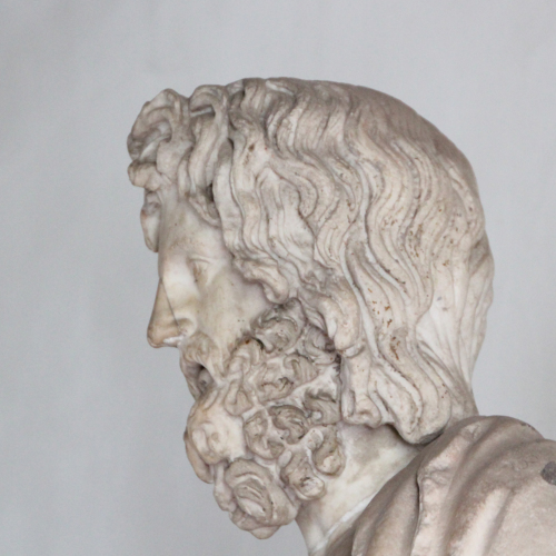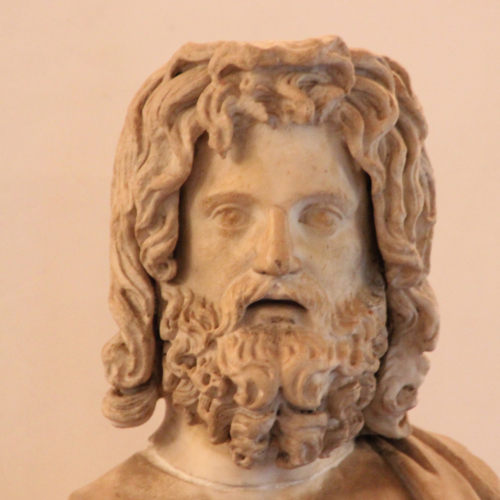 La testa, lavorata a tutto tondo, sebbene rifinita solo frontalmente, ritrae una figura maschile caratterizzata dalla folta chioma con capelli ondulati sul capo, a grandi boccoli lungo le tempie sino allaltezza del mento e dalla grande barba, anchessa riccioluta e spartita nella parte mediana in due bande. É proprio sul capo che si individua ancora il foro che serviva per linserimento del modio. Il viso è contraddistinto da una fronte ampia, da arcate sopraccigliari a semicerchio, da occhi grandi e profondi, dal contorno marcato: liride e la pupilla sono incisi e dipinti allinterno della cavità oculare. La bocca è costituita da labbra sottili e socchiuse, piegate verso il basso a donare unespressione di stupore e malinconia al volto.