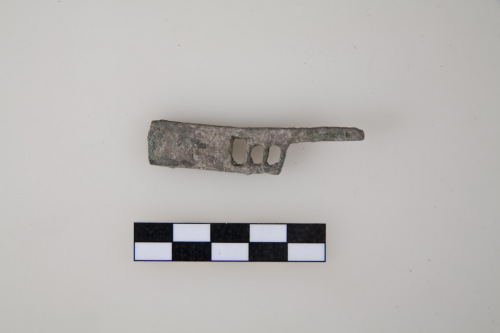 Elemento di serratura a scorrimento di forma rettangolare con tre fori rettangolari, uno più grande e gli altri due più piccoli, e desinente ad una estremità in una stretta linguetta. Patina color verde-marrone.