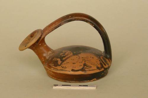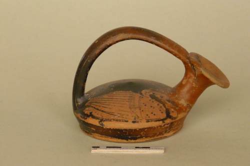 collo con versatoio laterale a orlo ingrossato e leggermente espanso, basso ventre lenticolare con carena e fondo piano; ansa a nastro sormontante impostata sulla carena e a metà del collo. Su un lato è la figura di un felino accovacciato e sull'altro un cigno, entrambi caratterizzati da una decorazione a puntini