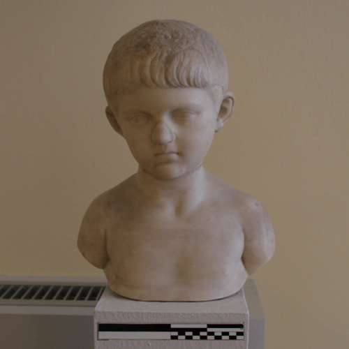 La testa ritrae un bambino in tenera età, il cui viso dall'ovale pieno e morbido, inclinato verso il basso, ha le guance paffute e delicate tipiche dell'infanzia. La fronte è stretta, le soppracciglia sfumano lievemente verso le tempie ombreggiando dolcemente lo sguardo, dando profondità e ampiezza ad un'espressione dolce e malinconica. I capelli sono corti: essi scendono in un'ordinata frangia sulla fronte, che si apre un poco al centro, laddove le ciocche, rese con sottili incisioni, sono lievemente mosse.