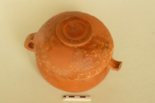 orlo introflesso, appena distinto da due linee incise, alto labbro bombato con attacco alla vasca sottolineato da una strozzatura, ventre emisferico schiacciato e basso piede ad anello.Anse costolate impostate a circa metà del labbro e fissate al ventre. La decorazione della parte inferiore è ripartita in triangoli da fasce di linee parallele, tra le quali si ripetono vari motivi, quali palmette, rosette, margherite e sono spaziate le lettere che compongono la firma CLEMENS. Argilla arancio con vernice rosso-arancio opaca.