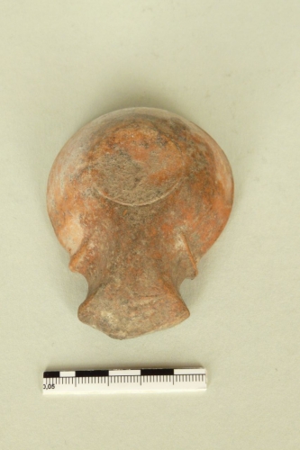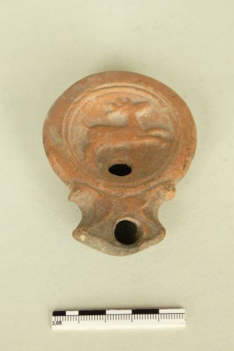Lucerna a becco triangolare con volute in argilla rosso arancio. Sul disco della lucerna (di tipo Loeschcke IC) è raffigurato, entro due cerchi concentrici, un cervo in corsa verso destra.