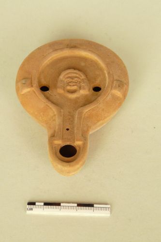 Lucerna in argilla arancio con canale aperto fino all'estremità del beccuccio (tipo Buchi x a). Sul disco, tra due infundibula disposti orizzontalmente, una maschera; due borchiette sulla spalla e piccolo foro nella zona centrale del canale. Sul fondo entro tre cerchi concentrici è il marchio C.DESSI, riferibile ad una officina norditalica attiva dalla pima metà del II al III secolo d.C.