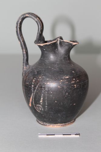 Oinochoe con largo e basso piede a disco sagomato, corpo a profilo ovoidale poco slanciato e breve collo che termina con un orlo trilobato. L'ansa a nastro sormontante è piatta all'esterno e leggermente convessa all'interno. Nel corpo è presente un motivo decorativo dipinto quasi completamente evanido, che originariamente doveva rappresentare un racemo vegetale stilizzato; alla base del collo è presente una fascia campita da una sequenza di brevi tratti verticali. Il reperto presenta, inoltre, un decoro graffito post-cottura che rappresenta una civetta, probabilmente realizzato in epoca moderna.