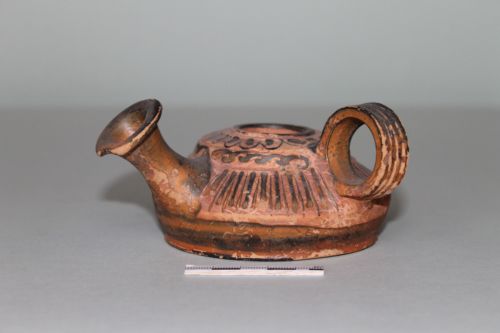 Askos con corpo a profilo biconico schiacciato, basso piede a disco leggermente concavo e lungo beccuccio versatore obliquo con orlo svasato e labbro arrotondato; l'ansa a nastro si imposta sulla spalla ed è marcata da una sequenza di nervature parallele. L'imboccatura circolare superiore, definita da un labbro appena rilevato, è caratterizzata da un filtro forato. Il decoro dipinto presenta una sequenza alternata di segmenti verticali larghi e sottili che interessano tutto il corpo mentre sulla spalla è presente un motivo a onda. Una sequenza di ovuli circonda l'imboccatura circolare superiore.