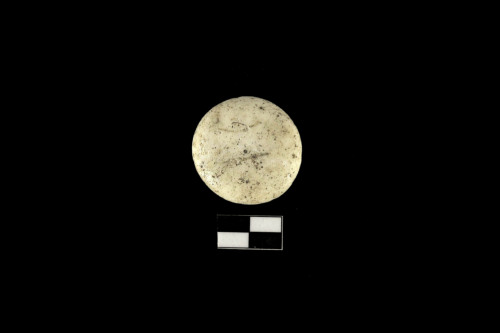 Pedina da gioco in pasta vitrea biancastra, di forma discoidale fortemente appiattita, irregolarmente piana alla base e un po rigonfia superiormente.