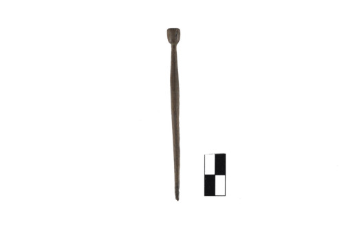 Spillone con testa ovale cilindrica e superiormente piatta, distinta dallo stelo, che presenta un ingrossamento mediano, a sezione circolare e con estremità appuntita.