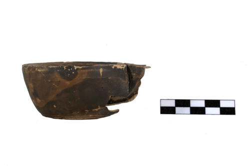 Lucerna a volute, serbatoio troncoconico, spalla inclinata verso linterno con tre solcature concentriche, incise e tre cordoli in rilievo, il disco fortemente concavo è decorato da 26 baccellature disposte attorno allinfindibulum centrale limitato da una fascia a tre anelli rilevati, volute plastiche aggettanti e desinenti a ricciolo, becco angolare. Foro di sfiato al centro del becco, in asse con il foro di alimentazione. L'argilla è di colore camoscio, la vernice è bruna molto scura e diluita.