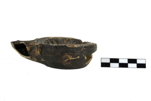 Lucerna a volute, serbatoio troncoconico, spalla piatta e sottolineata da tre solcature concentriche, incise profondamente, e da tre cordoli, il disco a pareti concave è decorato da 16 baccellature disposte attorno allinfindibulum centrale, delimitato da un piatto anello, volute plastiche a bottoncino rotondo. Fondo leggermente concavo delimitato da due solcature concentriche. Foro di sfiato sull'attacco del becco, al centro, foro di bruciatura allestremità del becco triangolare. L'argilla è di colore camoscio, la vernice è bruna molto scura e diluita.