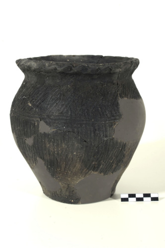 Olla con orlo esoverso leggermente ingrossato e decorato sul bordo esterno da un motivo ondulato, pizzicato, corpo di forma ovoide con spalla arrotondata, fondo piatto. La superficie è decorata da fasce incise ottenute a pettine. La zona sotto lorlo fino allinizio dellarrotondamento della spalla è decorata da fasce incise trasversalmente, al di sotto sono due-tre scanalature concentriche, nell'ultima zona, dalla spalla fino al fondo, linee incise, irregolari, verticali e trasversali. Nella parete interna dell'orlo e del collo, scanalature orizzontali concentriche, irregolari. L'argilla è di colore grigio scuro con grossi inclusi biancastri, completamente bruciata dal fuoco.