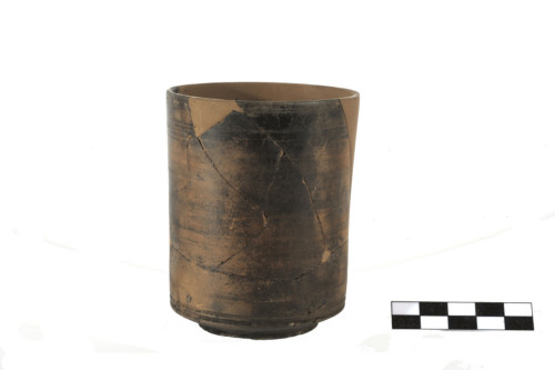 Bicchiere con orlo indistinto e tagliato, corpo cilindrico con pareti rettilinee e bassa carena sottolineata da due scanalature concentriche, basso piede ad anello, sul fondo scanalatura circolare, superficie levigata a stecca. L'argilla è di colore nocciola arancio, ingobbio interno ed esterno bruno, opaco, con chiazze rossastre.