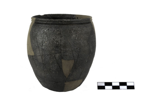Bicchiere a pasta grigia, a larga imboccatura con orlo verticale sottolineato allesterno da due solcature concentriche, corpo ovoidale decorato da linee incise intersecantesi ad X, fondo piatto. L'argilla, con piccoli inclusi biancastri, è di colore grigio scuro, l'ingobbio è bruno scuro con chiazze grigiastre.