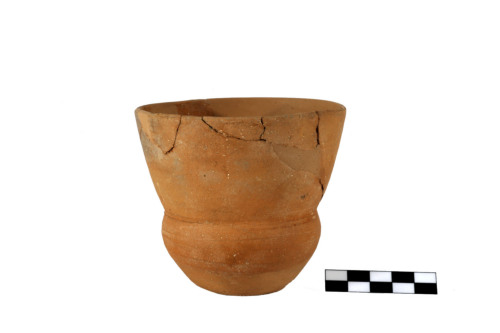 Bicchiere con alto orlo a pareti leggermente svasate, corpo globulare, fondo piatto con cerchio inciso al centro. Tracce di linee incise sul corpo. L'argilla è di colore arancio, con piccoli inclusi bianchi. Questo tipo di bicchiere fu prodotto, probabilmente, nella Valle del Po, e diffuso, principalmente, nella parte occidentale della pianura padana, ma presente anche in Italia centrale e centro-settentrionale. Molti esemplari provengono da Ornavasso e da Gabi.