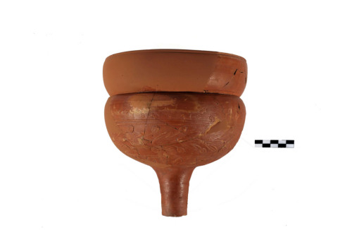 Imbuto con orlo estroflesso, piatto superiormente e sottolineato esternamente da una solcatura, alto bordo a pareti convesse, corpo globulare decorato a matrice in tre fasce, separate da coppie di listelli a rilievo: fascia superiore, tralcio dedera e, sparse quà e là, rosette a sei petali; fascia centrale, motivo di foglie di forma oblunga con costolatura centrale e bordi frastagliati, dalle quali spuntano steli con boccioli, fascia inferiore, tre file di punte lanceolate, imbuto con collo cilindrico. La forma sembra un adattamento ad imbuto di una coppa Sarius tipo 13D tipo B della Mazzeo Saracino. L'argilla è di colore arancio, dura e compatta, la vernice è di colore rosso corallo.