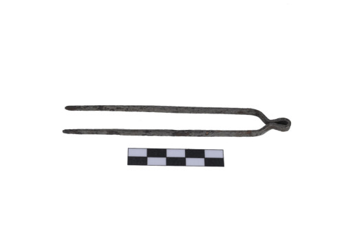 Pinzetta con apice a molla, impugnatura a goccia, con due linee oblique nel punto di pressione delle dita dalle quali scendono le due branche rettilinee con estremità appiattite, sezione rettangolare piatta.