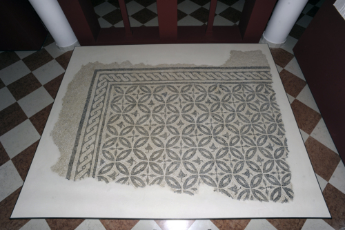 Tessellato geometrico con tessere di calcare di forma regolare bianche e nere. Il pavimento è costituito da una fascia di raccordo a ordito obliquo in tessere bianche, un bordo semplice a treccia a due capi in tessere bianche e nere e il campo è a decorazione geometrica a piccolo modulo ripetuto di "cerchi allacciati", ossia composizione ortogonale di cerchi secanti, formanti quadrati con effetto di quadrifogli di fusi delineati da due file di tessere nere e campiti di bianco. Nei quadrati sono inseriti, in alternanza, una foglia d'edera o un fiore quadripetalo a tessere nere. Le tessere erano sistemate in un letto di calce gettato sopra uno straterello molto resistente di cocciopesto dello spessore di 1 cm con un sottofondo di malta brunastra e cocci che copriva uno strato di cm 40 di terreno nerastro misto a frammenti di laterizi e di intonaco dipinto. Il motivo a "cerchi allacciati" è ampiamente diffuso nel territorio veneto: gli esemplari più antichi, in bicromia bianco-nera, sono presenti ad Adria e ad Este, molti policromi, di fine III sec. d.C., sono stati rinvenuti a Verona, Vicenza, uno solo a Padova (vd. Rinaldi 2007, pp. 173-175).