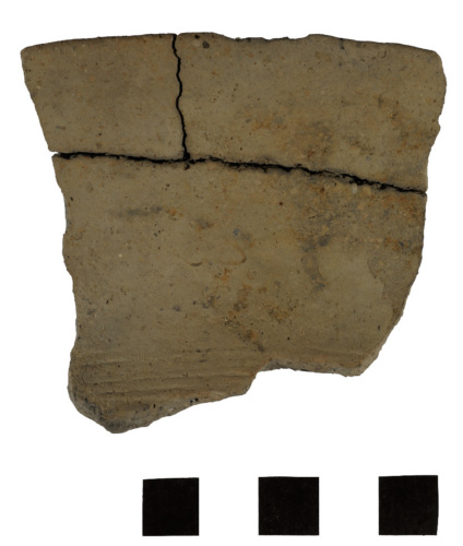 frammento di orlo esoverso con labbro assottigliato pertinente a un vaso biconico; superfici levigate con tracce di ingobbio chiaro (beige); sulla superficie esterna, in corrispondenza del collo è presente una fascia formata da 6 solcature sottili e parallele; impasto fine di colore grigio chiaro