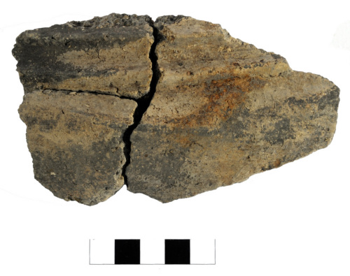frammento di parete carenata pertinente a un grande vaso biconico; carena arrotondata decorata da costolature elicoidali; al di sopra della carena sono presenti due cordoni lisci paralleli e orizzontali; superfici lisciate di colore grigio; impasto grossolano di colore grigio-nero