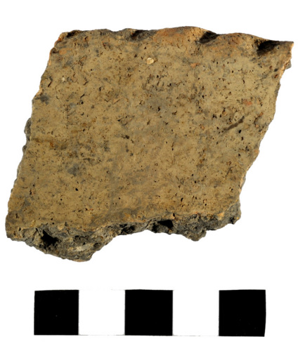 frammento di orlo esoverso con labbro assottigliato, decorato con tacche e pertinente a un vaso biconico; la superficie esterna è levigata e quella interna lisciata, colore grigio-arancio; impasto grossolano di colore grigio