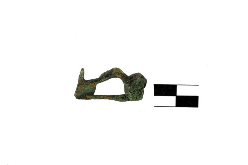 Fibula a molla, del tipo kräftig profiliert", con arco fortemente profilato a sezione lenticolare, staffa piena di forma rettangolare, a T, con terminazione a uncino. Patina color verde oliva. Questo tipo di fibule ebbero un'ampia diffusione, in particolare nel I sec. d.C., nel Norucum, Pannonia, Boemia, Moravia, Baltico, Scandinavia, province renane, basso Danubio, Italia settentrionale.