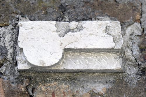 Frammento di cornice, a listello piatto con una sporgenza a semicerchio; immediatamente sotto, si distingue un piano scalpellato.