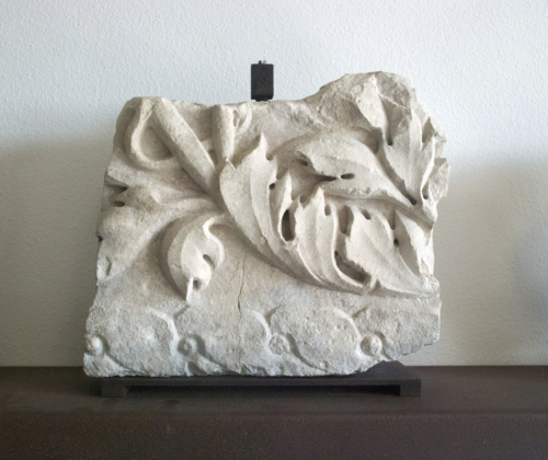 Fregio decorato con girali d'acanto, di cui è visibile un tralcio coperto da brattee plasticamente ripiegate e distinte in lobi; sotto corre una fascia decorata a doppi nastri, ottenuti a bassorilievo, che si intrecciano a formare elementi floreali al cui centro risaltno pistilli rilevati.