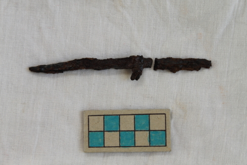 Coltello con lama diritta ad un taglio. La sezione della lama proseguiva nella grande immanicatura in materiale deperibile, probabilmente legno, di cui rimane la nervatura d'ammorsamento che fissava la guancetta andata perduta.