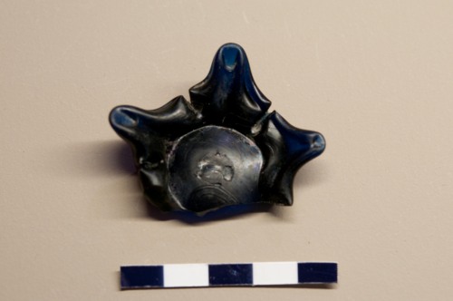 Base di saliera o coppa di piccole dimensioni probabilmente con corpo a forma. la saliera alla base ha un anello pinzato e forgiato in moda da formare dei piedini ben distinti. Le pinzature sono modellate in modo molto regolare e separate da tagli netti. Il frammento in questione è pertinente ad un recipiente con 5 piedini. Il colore del vetro è blu opaco. La coppa è ottenuta a stampo.
