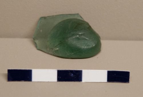 Frammento di parete di bicchiere di vetro verde, con grande goccia applicata e appiattita di forma ovale. Il frammento appartiene ad un bicchiere del tipo a Krautstrunk (a forma di cavolo), con piede dentellato, corpo ovoidale o a botte, e orlo espanso e convesso.