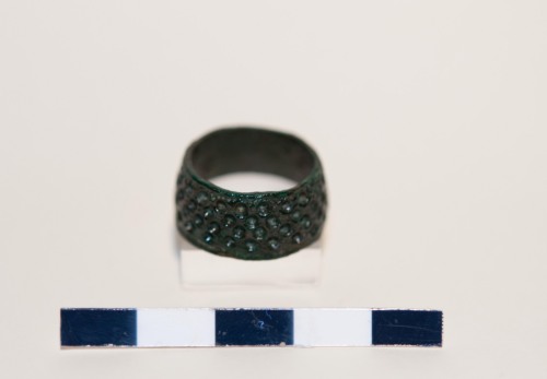 Ditale ad anello in lega di rame. Ditale a forma troncoconica decorato con 4 linee di punzonature a punti . Alla base leggera linea incisa. Interno liscio.