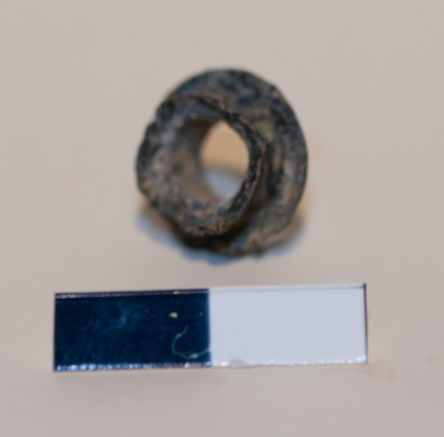 Rivetto, passante rinforzato per vestiario. Il rivetto è formato da un’unica lamina in lega di rame ripiegata e poi battuta per essere saldata al manufatto a cui era destinata. Data l’altezza del rivetto, pare essere stato usato su una striscia di cuoio non molto spessa (quindi una cintura) o un tessuto consistente.