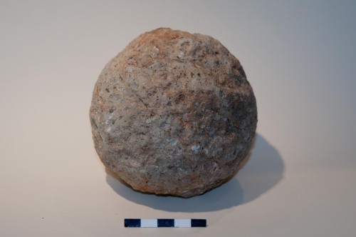 Proiettile, sfera da artiglieria in pietra vulcanica di colore grigio/giallo/marrone ricca di miche (nere) e feldspati . Leggermente lisciata in superficie e leggermente gradinata. La palla ha un calibro di 11,2 cm, ed è compatibile con armi da artiglieria leggera da campo quali la colubrina media o il falcone/falconetto, e probabilmente va associata ad una cronologia tra il XV e il XVI secolo. La roccia sembra essere un litotipo piuttosto pregiato e tenace, di origine veneta, ovvero la trachite dei vicini Colli Euganei (Padova). Si tratta dello stesso materiale con cui sono realizzate le pavimentazioni stradali tardo medievali e rinascimentali a Venezia.