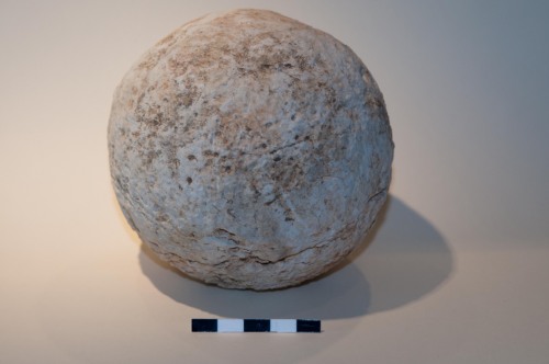 Proiettile, sfera da artiglieria in pietra calcarea bianca, lisciata in superficie. La palla ha un calibro di 11,5 cm, ed è compatibile con armi da artiglieria leggera da campo quali la colubrina media/piccola o il falcone/falconetto, e probabilmente va associata ad una cronologia tra il XV e il XVI secolo. Il calcare sembra essere un calcare veneto, in particolare il Biancone dei vicini Colli Euganei (Padova).