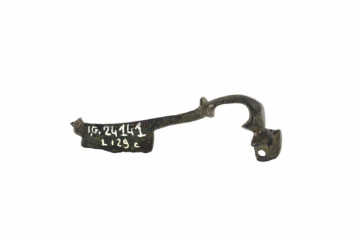 Fibula tipo kräftig profiliert, con arco profilato e nodo mediano, staffa trapezoidale chiusa, terminante a bottone allinsù, molla in unico pezzo a 8 avvolgimenti, corda esterna e gancio per lappendimento, arco allungato a forma di S. Questo tipo di fibula era diffusa in Pannonia, Dacia, Noricum, a nord del Danubio, Italia settentrionale. Patina di colore verde scuro.