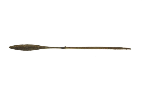 Specillum (cyathiscomele) con stelo a sezione circolare, appuntito allestremità superiore, linee verticali, incise sulla superficie dello stelo, rigonfiamento nella parte inferiore dello stelo, verso la spatola, questa è oblunga, lanceolata, concava nella parte interna. Questo strumento era utilizzato in diversi modi: come strumento chirurgico (per esplorare cavità del corpo, per mescolare e somministrare farmaci), in campo oculistico (per applicazione di colliri), come strumento da toeletta (per mescolare e applicare prodotti di cosmesi) o in pittura (per mescolare i colori) (cfr. Tabanelli 1958, cit., pp. 78-79). Patina di colore verde-marrone.
