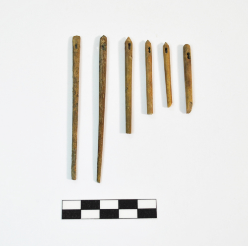 Sei aghi con stelo a sezione circolare, cruna costituita da due fori circolari contigui, formanti un otto e praticati col trapano, quattro aghi presentano testa a punta, uno rettangolare piatta e un altro rotonda.