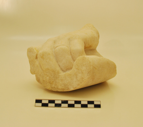 Grosso frammento di mano s. con anello con grande castone piatto, ovale allanulare, regge forse un volumen, il pollice e lindice stringono il bordo rotondo, il mignolo è piegato verso linterno. Polso non levigato, sbozzato, con foro centrale per alloggiamento della staffa. Marmo bianco a grana grossa.