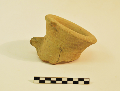 Bocca imbutiforme di anfora con orlo ingrossato, svasato e arrotondato superiormente, distinto dal collo cilindrico solo da un lieve gradino inciso, attacco dellansa a nastro e a sezione ovoidale impostata sul collo, subito sotto il gradino. L'argilla è di colore rosso-arancio con inclusi, superficie grigiastra.