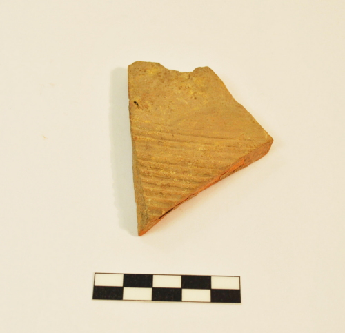 Frammento di parete di anfora a superficie corrugata, fitte e profonde scanalature parallele, orizzontali, ottenute con strumenti vari (pettini, stili). L'argilla è di colore rossiccia, l'ingobbio è camoscio scuro.
