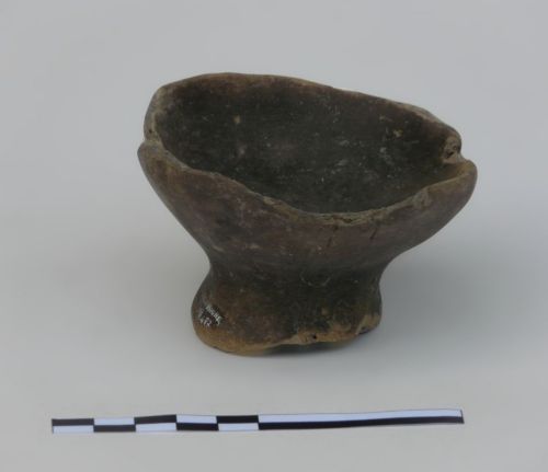 piccola coppetta su piede cavo, con vasca emisferica, orlo liscio e ansetta canaliculata impostata dall'orlo sulla parete